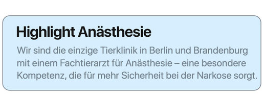 Wir sind übrigens die einzige Tierklinik in Berlin und Brandenburg mit einem Fachtierarzt für Anästhesie – ein Alleinstellungsmerkmal, auf das wir sehr stolz sind.