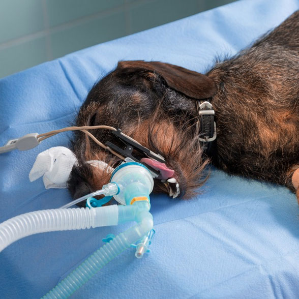 Über einen Tubus atmet das Tier ein Narkosegas ein, das eine gleichmäßige und steuerbare Narkose ermöglicht. Ihr Fachtierarzt für Inhalationsnarkose in Berlin.
